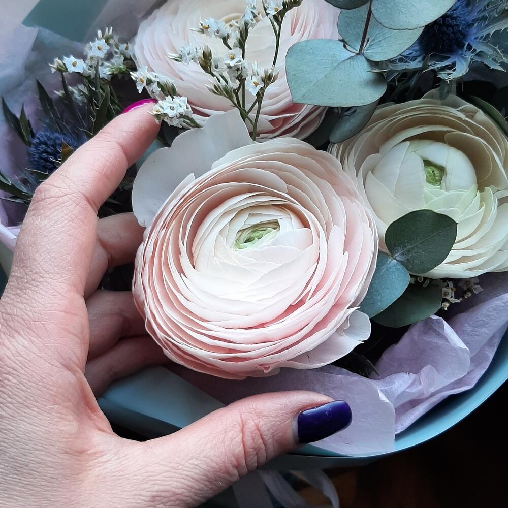 ранункулюс экстра ханой – 3 шт.Эрингиум – 1 шт.Эвкалипт – 1 шт.Лимониум – 1 шт.Упаковка дизайнерская – 1 шт.