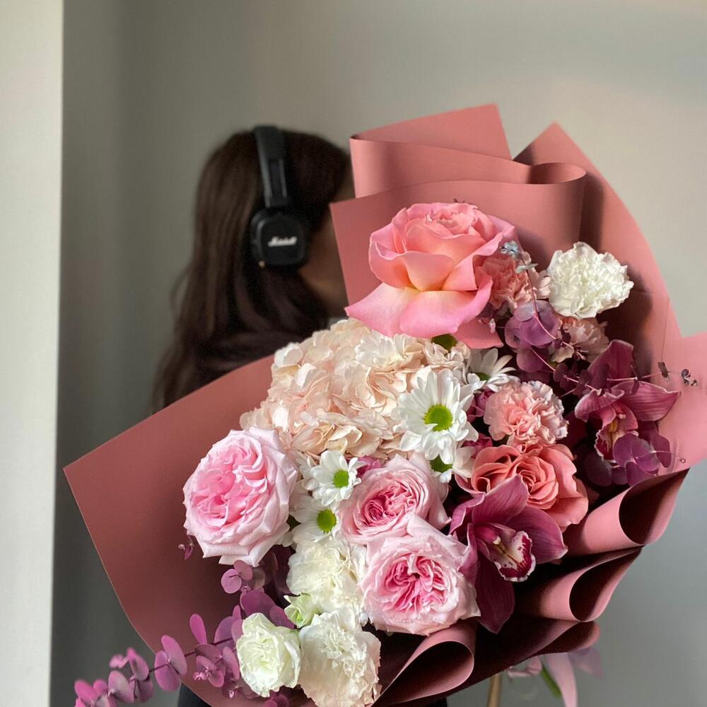 розы – 5 шт. Лизиантус – 2 шт. Гвоздика – 3 шт. Хризантема – 2 шт. Гортензия – 1 шт. Спрей – 2 шт. орхидея – 2 шт. Эвкалипт – 2 шт.