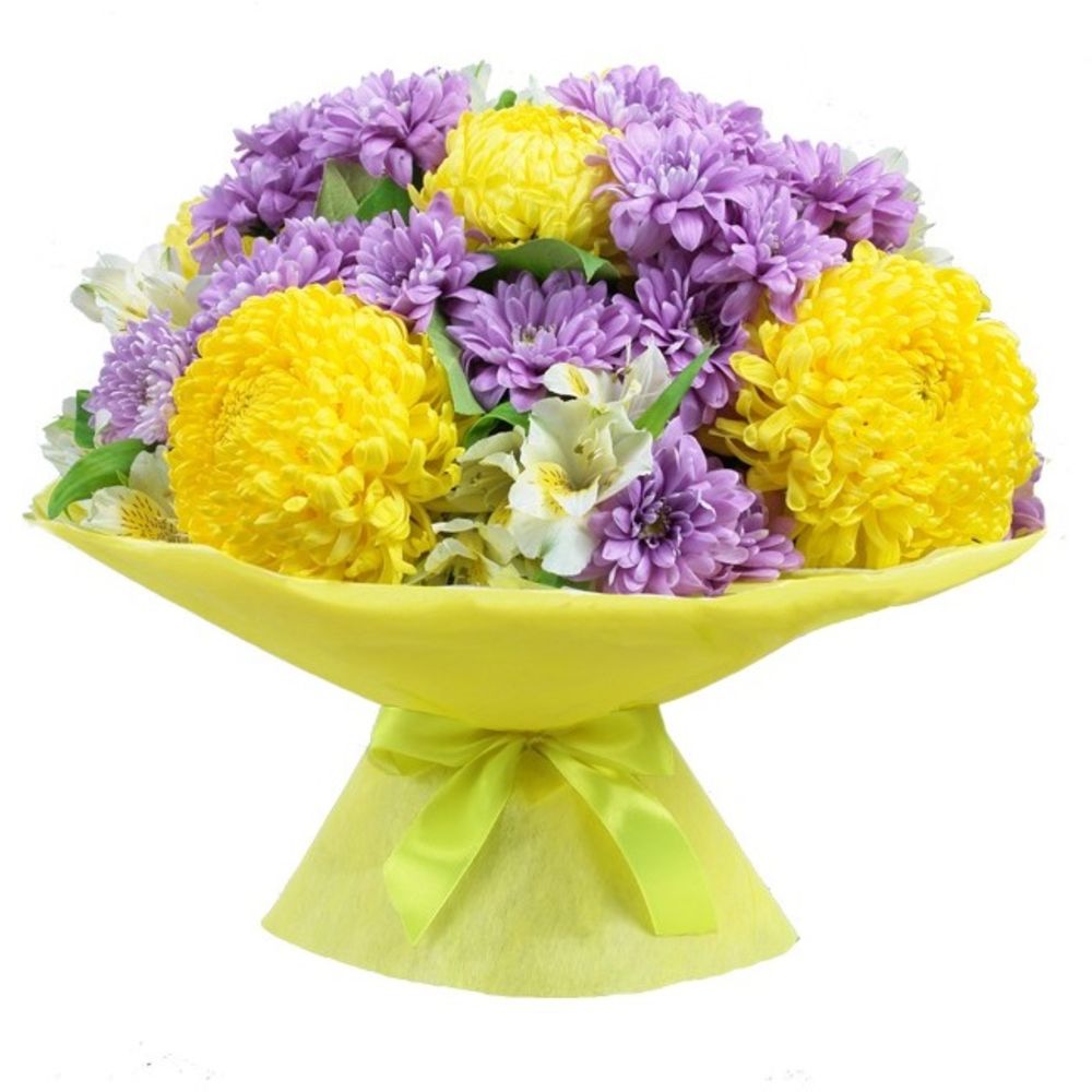 Листья салал – 1 шт.лента декоративная – 1 шт.Фетр – 1 шт.Альстромерия белая – 6 шт.Хризантема кустовая розовая – 7 шт.Хризантема одноголовая желтая – 7 шт.