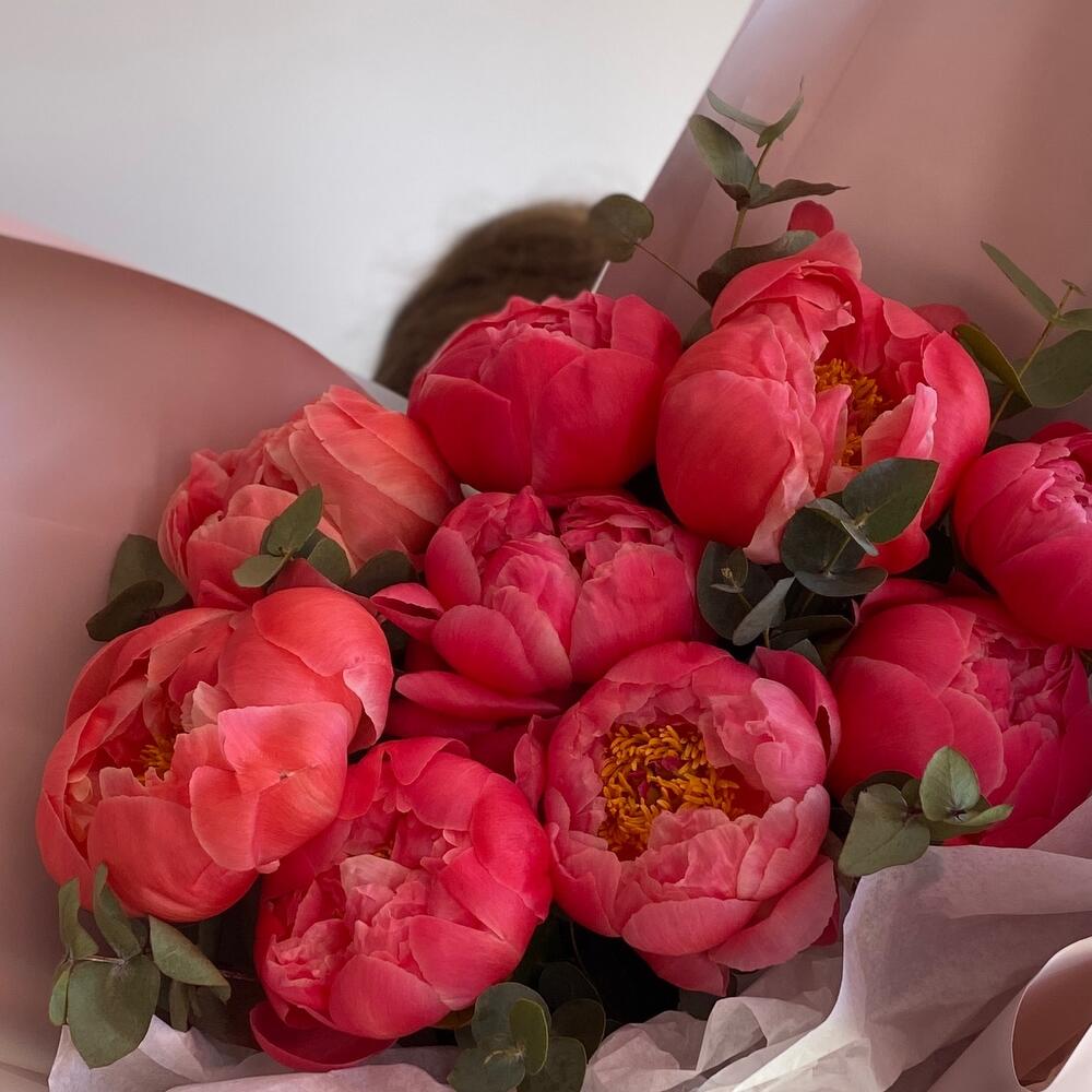 Яркие пионы коралл- шарм , в стильной упаковке от наших флористов ❤️