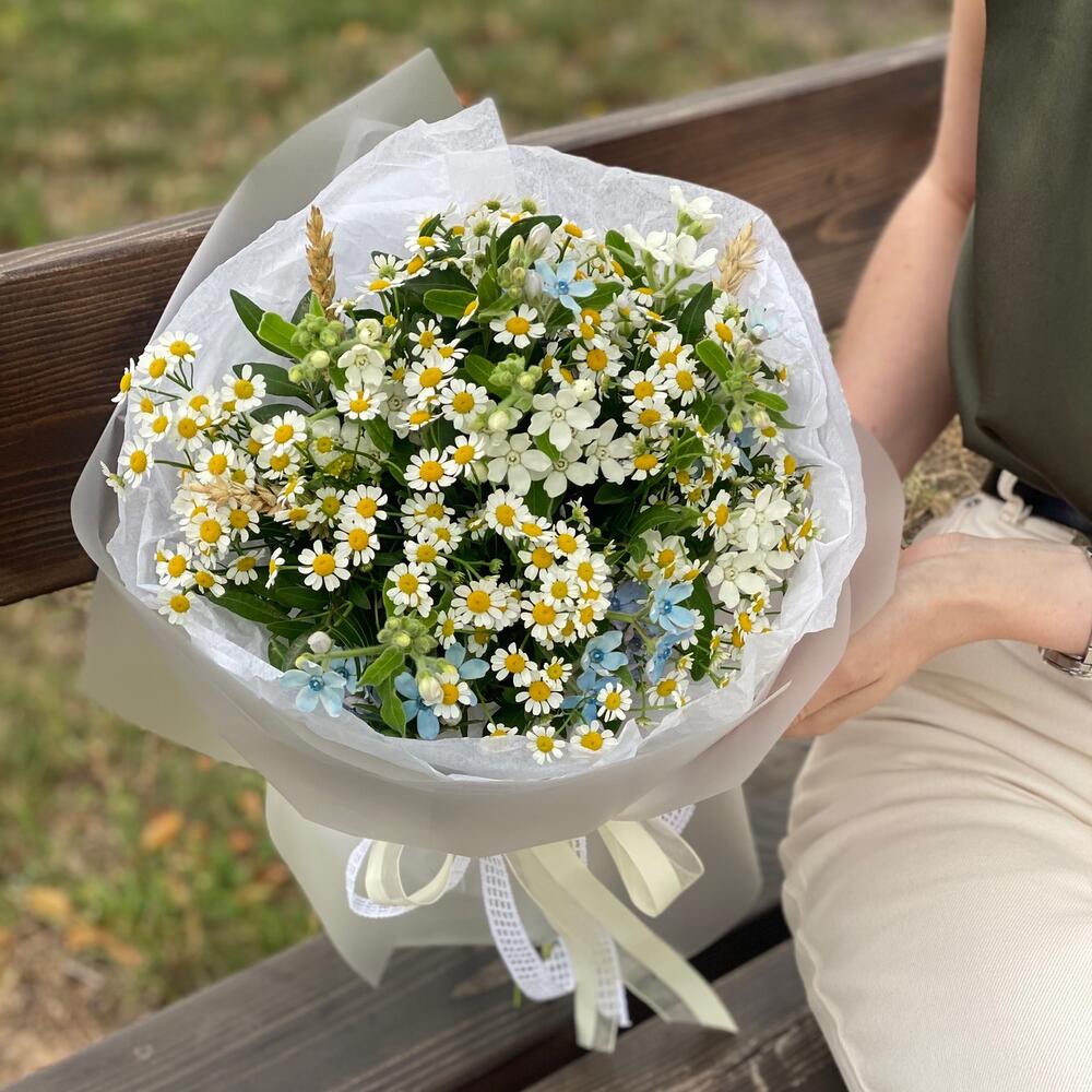 Букет из полевой ромашки и цветков оксипеталума с добавлением колосков в оформлении!