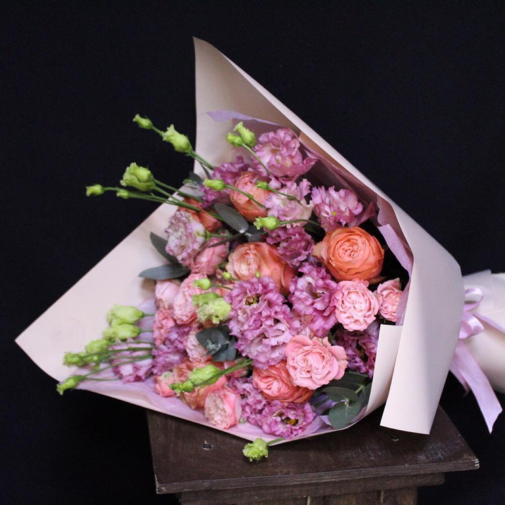 Роза пионовидная кахала – 7 шт.эустома махровая – 5 шт.Роза кустовая пионовидная мадам бомбастик – 3 шт.Эвкалипт – 2 шт.Тишью – 2 шт.Пленка дизайнерская – 2 шт.Лента атласная – 2 шт.