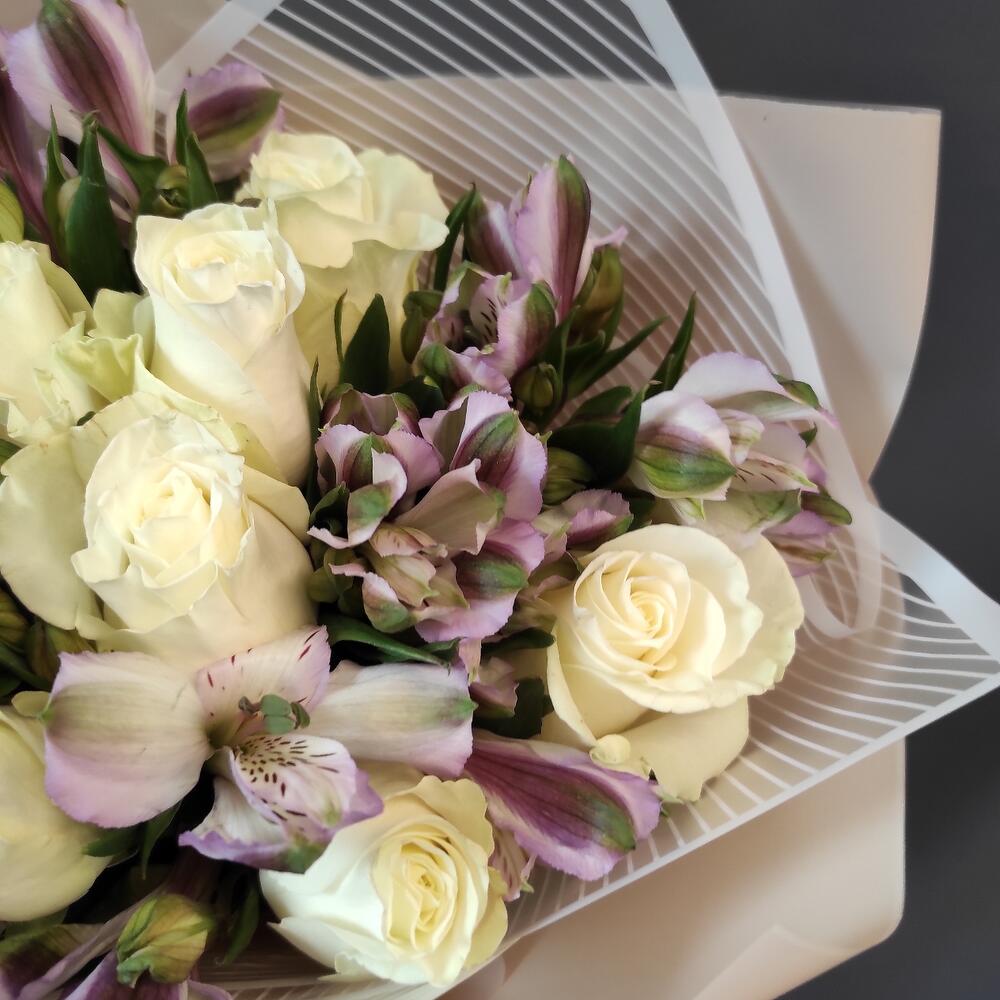 Букет из белых роз с фиолетовой альстромерией S