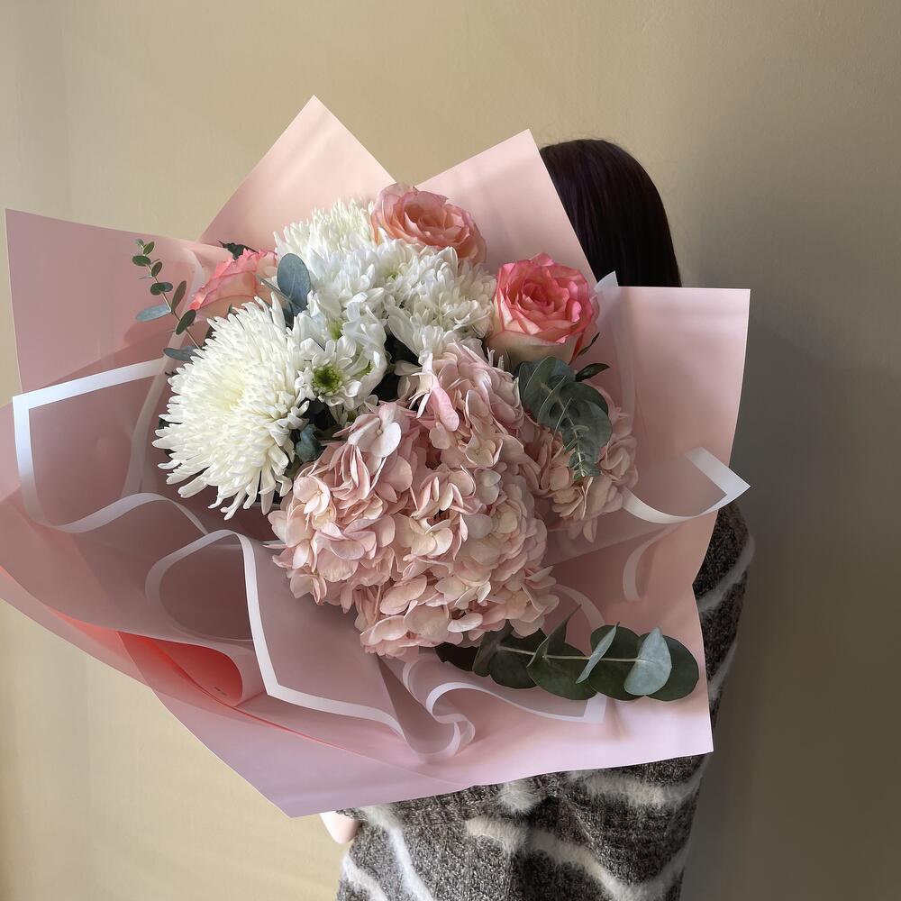 Альстромерии, Гортензии, Кустовые розы, Лизиантусы, Розы, Хризантемы