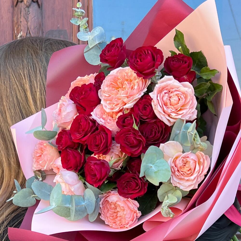 Эвкалипт – 3 шт.Лента атласная – 2 шт.Пленка матовая – 5 шт.роза пионовидная кустовая джульетта – 4 шт.роза кустовая пионовидная ред трендсеттер – 5 шт.