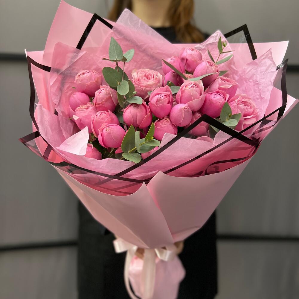 Эвкалипт – 3 шт.Лента атласная – 2 шт.Тишью – 2 шт.Пленка матовая – 4 шт.пленка дизайнерская с каймой – 2 шт.роза кустовая пионовидная сильва пинк – 5 шт.