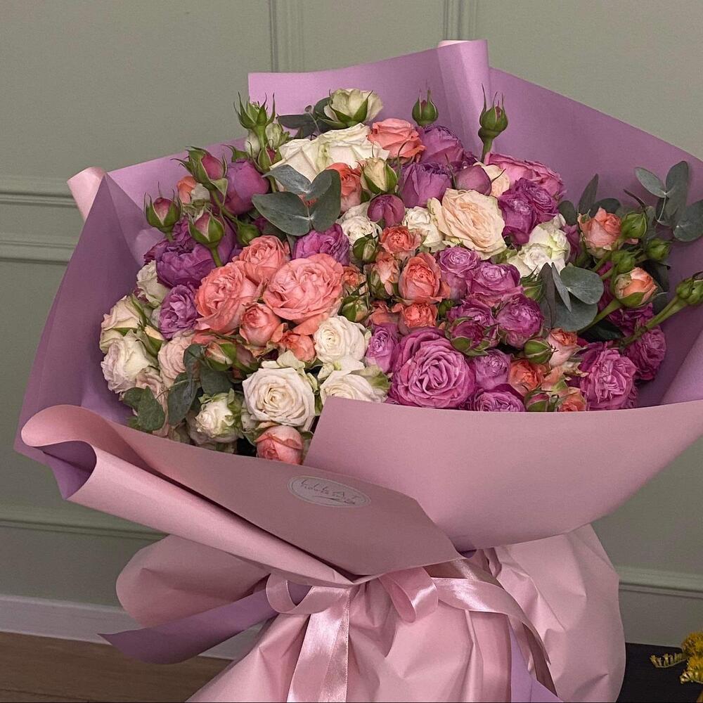 кустовые пионовидные розы – 51 шт. Упаковка дизайнерская – 5 шт. Атласная лента – 2 шт. Открыточка с вашими пожеланиями – 1 шт.