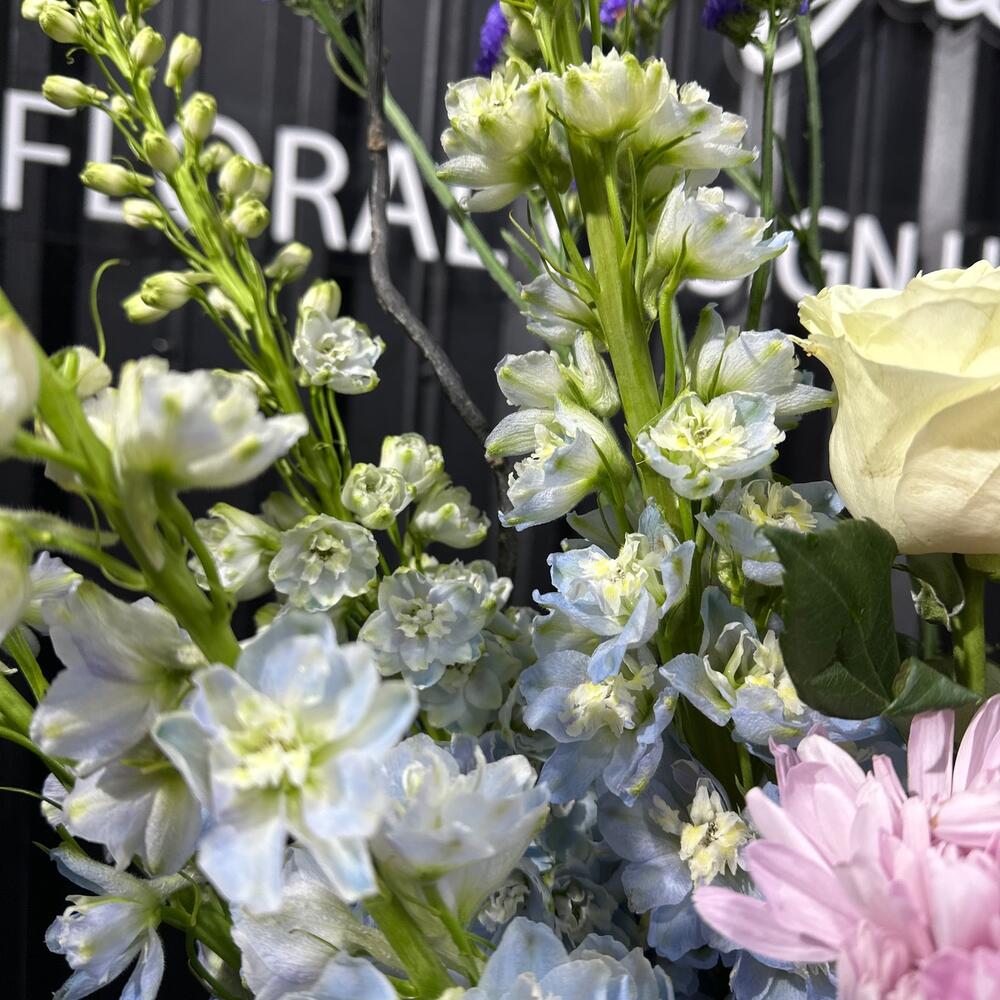 Букет, составленный из статицы, роз и дельфиниума, представляет собой мягкое и воздушное произведение искусства. Статица добавляет нотки изысканной грациозности и стойкости, розы приносят тепло и нежность, а дельфиниум создает атмосферу загадочности и нежных оттенков голубого неба. Этот букет словно путешествие через эмоциональные грани, в котором каждый цветок вносит свой уникальный вклад в гармонию и красоту композиции.