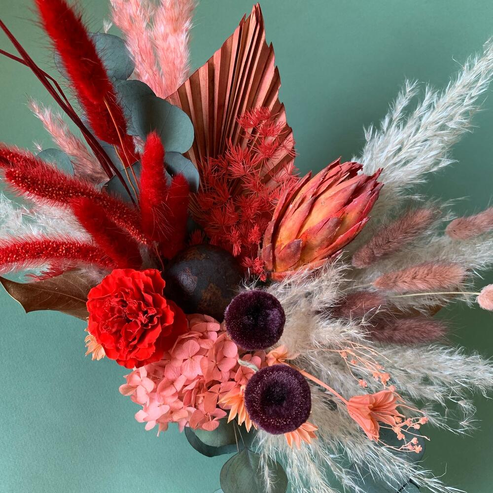 Кашпо керамическое – 1 шт.Роза стабилизированная – 1 шт.пампасная трава – 5 шт.Эвкалипт стабилизированный – 2 шт.Лагурус (сухоцвет) – 12 шт.Нигелла сухоцвет – 5 шт.пальма пика – 1 шт.Оазис флористический – 1 шт.листья магнолии – 2 шт.гербера сухоцвет – 2 шт.аспарагус стабилизированный – 3 шт.гортензия стабилизированная – 1 шт.сетария сухоцвет – 3 шт.Протея африка – 1 шт.