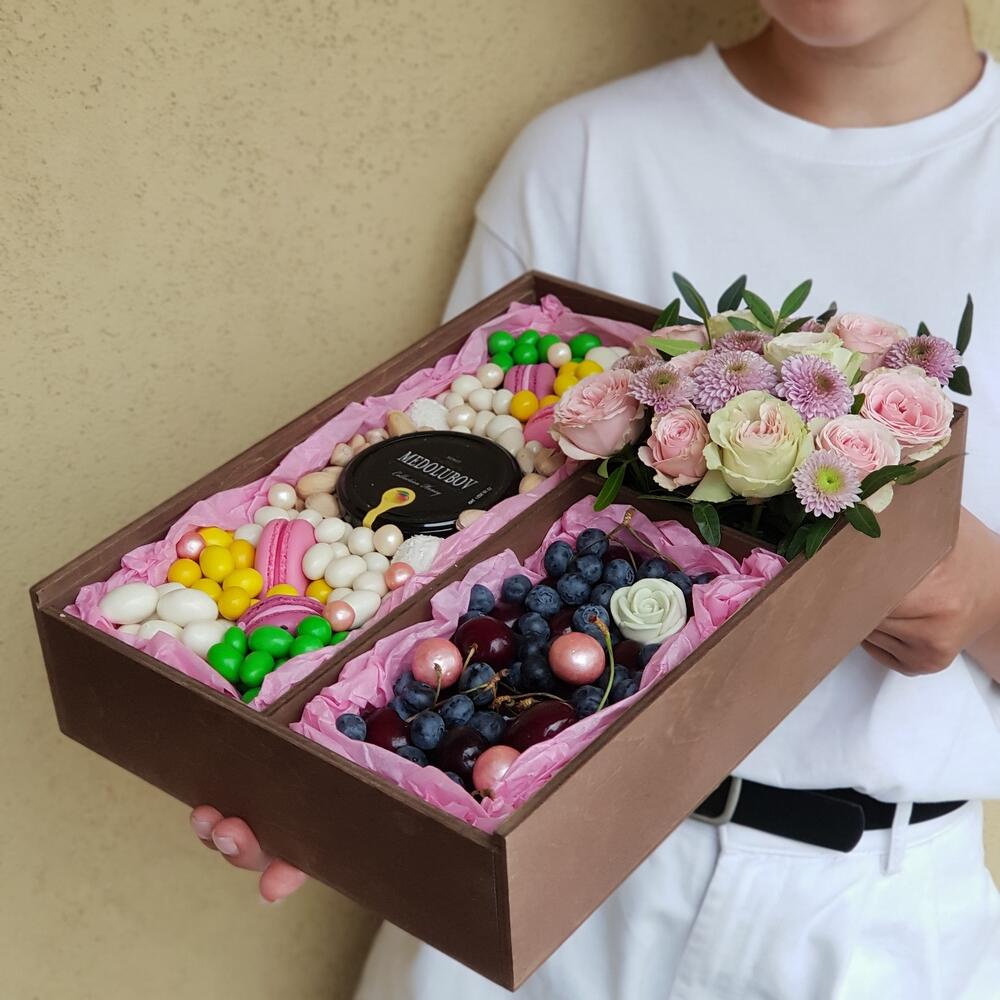 Роза кустовая – 3 шт.Хризантема Сантини – 1 шт.Конфеты Raffaello – 2 шт.Фисташка – 1 шт.Зефир в шоколаде – 5 шт.Голубика – 100 гр.Черешня – 280 гр.Пирожные макарон – 4 шт.Роза шоколадная – 1 шт.Фисташки – 30 гр.крем мед medolubov – 240 гр.банан сушеный – 150 гр.кешью в белом шоколаде – 100 гр.арахис в сахарной глазури – 140 гр.арахис в кунжуте – 140 гр.смородина в шоколаде – 20 гр.арахис в белом шоколаде – 100 гр.арахис в цветной глазури – 160 гр.рисовые шарики в шоколаде – 10 гр.транспортировочный крафт пакет – 1 шт.