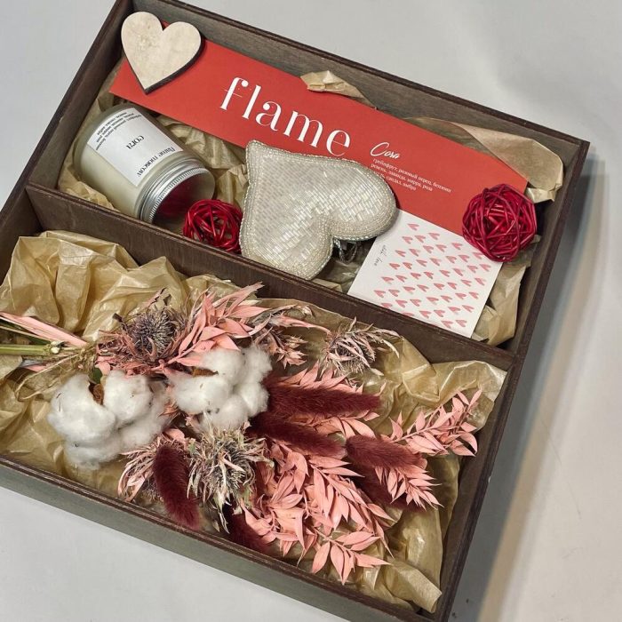 свеча (кокосовый воск) – 1 шт.благовония – 1 шт.сердце декоративное – 1 шт.Сердце деревянное – 2 шт.Шар ротанг – 2 шт.Открытка – 1 шт.рускус стабилизированный – 1 шт.Хлопок – 2 шт.эрингиум сухоцвет – 1 шт.Лагурус (сухоцвет) – 7 шт.Тишью – 1 шт.Ящик деревянный – 1 шт.